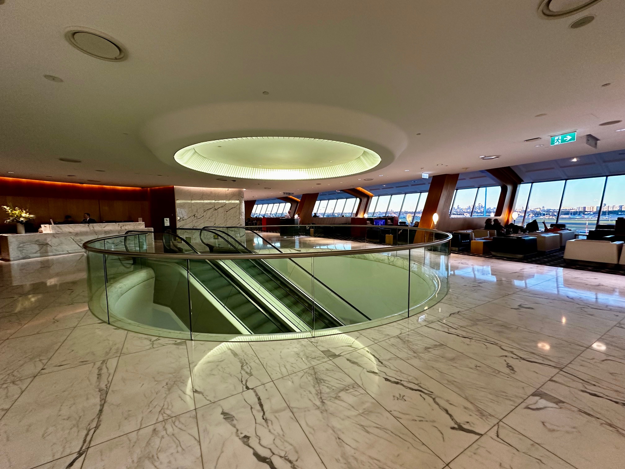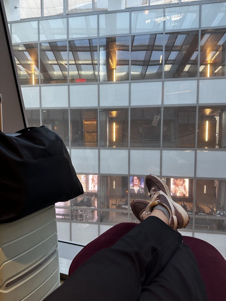 The upper deck is dedicated to business class and premium economy while downstairs is all of economy and first class. At the front of the plane is a lounge for first and business class passengers with a large monitor for watching movies, seating around a table with seatbelts if needed, and a pantry with snacks and beverages. This is a great spot for families with young children who may need a bit of space to move around during a long flight.