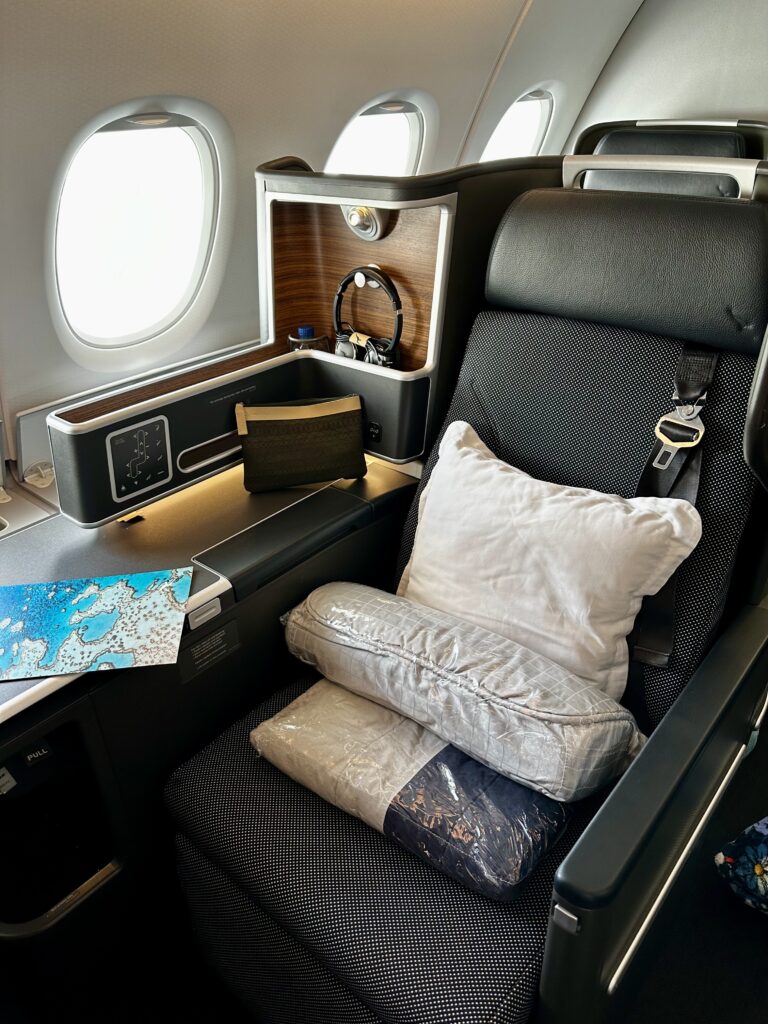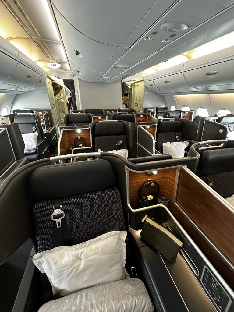First class has a 1-1-1 configuration with each passenger having their own suite. At this time there’s not a door to the suite but the upcoming A350 will have 6 first class suites and 50 business class suites with closing doors.